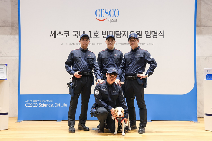 종합환경위생기업 세스코가 지난 6일 서울 강동구 세스코 본사에서 국내 1호 빈대탐지견 ‘세코’의 임명식을 진행하고 있다 / 사진=세스코 세코는 세스코 서비스 컨설턴트로서 빈대 확산 예방을 위한 특수 임무를 수행한다. 세스코는 새로운 빈대 차단 해법인 빈대 탐지견 세코의 활동을 본격화할 예정이라고 밝혔다. 세코의 예상 활동 기간은 약 8년이나 실제 건강 상태에 따라 달라진다.