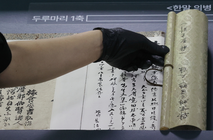 14일 오전 서울 종로구 국립고궁박물관에서 열린 환수 문화유산 공개 행사에서 관계자가 ‘한일관계사료집’ 및 ‘한말 의병 관련 문서’ 두루마리,‘조현묘각운 시판’을 공개하고 있다. <연합뉴스>