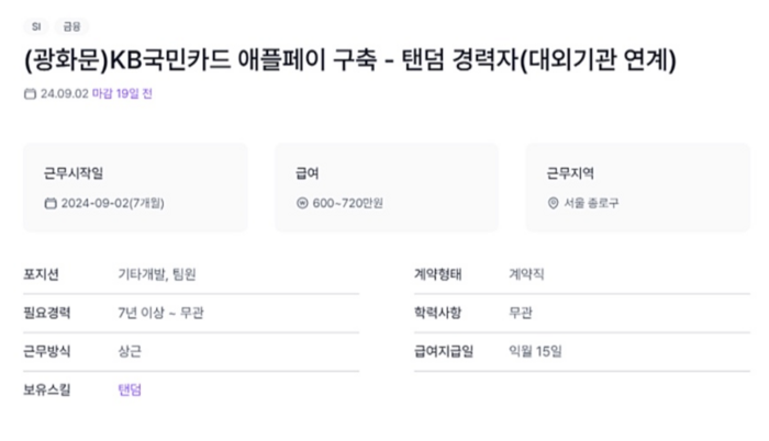 14일 개발자 구인 사이트에 ‘KB국민카드 애플페이 구축 - 탠덤 경력자’ 라는 제목의 계약직 구인 공고가 올라왔다.