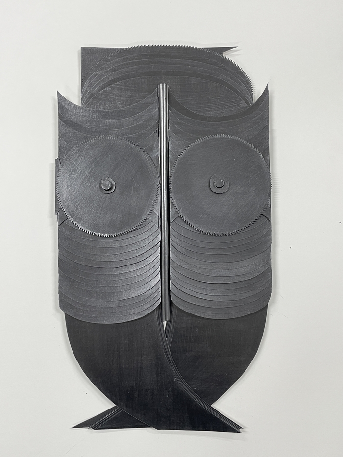 낮은,고요히 돌아가며 부르는 이름 [지갤러리] 톱니바퀴 눈을 가진 올빼미가 걸려있다. 검은 피부는 종이에 흑연을 칠해 만들었다. 얇은 종이를 겹겹이 붙여 몸피를 만든 이 조각의 이름은 ‘낮은,고요히 돌아가며 부르는 이름’. 조명이 반사되면 조각은 은은한 빛을 발해 금속같은 질감을 만들어낸다. 재료의 가능성을 최대한 활용한,손으로 빚어낸 예술이다.