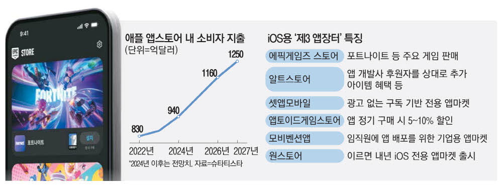 제3의 앱장터가 속속 등장하면서 애플 매출도 변화가 불가피할 것으로 보인다. 슈타티스타에 따르면,애플 앱스토어 내 소비자 지출 규모는 2022년 830억달러에서 2023년 860억달러로 증가했다. 2027년에는 1250억달러로 커질 전망이다.