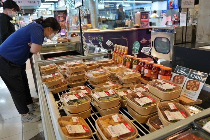 업계가 저렴한 마트 한 끼 만들기에 나선 건 외식 물가가 치솟으면서 소비자들의 점심 풍경이 바뀌고 있기 때문이다. 전국 직장인이 쓰는 점심값의 평균이 1만원을 넘어선 가운데,서울 송파구에 있는 월드타워점엔 이른 점심 시간대부터 직장인들이 몰리고 있다. 한 끼 식사로 제격인 ‘나시고랭’과 곁들임으로 먹기 좋은 ‘갈릭치킨스테이크’가 특히 인기를 끌고 있다. 경기 하남시에 사는 30대 직장인 김은경 씨는 “삼계탕이 2만원 가까이 돼 식당에서 외식하기가 두렵다”며 “주로 낮에 할인하는 마트 초밥을 사 먹는 경우가 많다”고 말했다.
