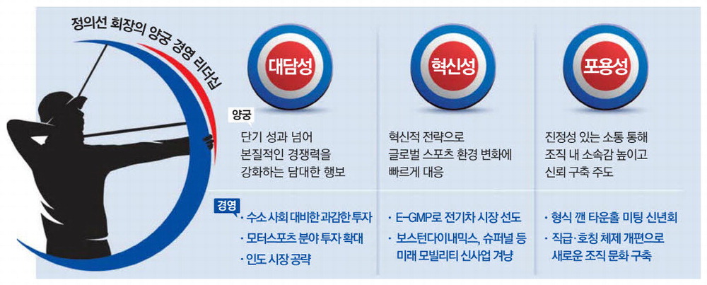 정 회장이 늘 강조하는 '혁신성'도 현대차그룹의 경영과 양궁에서 공통적으로 발견되는 대목이다. 현대차그룹은 완성차 업계에서 전동화 전환을 빠르게 추진하면서 전기차 전용 플랫폼인 E-GMP를 만들어냈다. 기업 안팎에서 전동화 회의론이 있을 때마다 그들을 설득하고 플랫폼 개발을 밀어붙여 빠르게 전동화 전환을 이룬 기업으로 자리 잡을 수 있던 건 정 회장의 혁신 리더십이 뒷받침됐기에 가능했다. 로봇 사업 진출을 위해 약 1조원을 들여 미국 보스턴다이내믹스를 인수하고 슈퍼널로 미래항공모빌리티(AAM) 사업에 손을 뻗은 것도 현재에 안주하지 않고 끊임없이 사업 혁신을 추구하려는 정 회장 의지가 반영됐다는 분석이다.