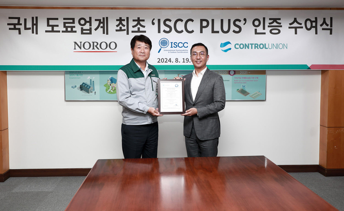 노루페인트가 국내 페인트 업계 최초로 글로벌 친환경 소재 인증 ‘ISCC PLUS’를 획득했다. 노루페인트
