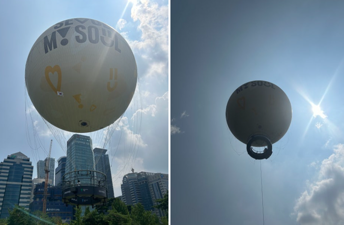 계류식 가스 기구 ‘서울달’ / 사진= 박한나 여행+ 기자 흔히 열기구하면 공중을 떠다니며 구름 속을 배회하는 튀르키예의 카파도키아 열기구가 떠오른다. 불을 지펴 양력으로 떠오르는 방식이다. 하지만 서울달은 일반적인 열기구와는 달리,헬륨가스를 이용해 부양한다. 이를 ‘계류식 가스 기구’라고 일컫는다. 서울달은 공기보다 가벼운 헬륨의 부력을 이용해 공중으로 떠오른 뒤 기구 밑에 달린 케이블을 따라 수직으로 비행한다. 일단 더운 날씨에 ‘열’로 떠오르는 기구가 아니라는 점에 한시름 놓았다.