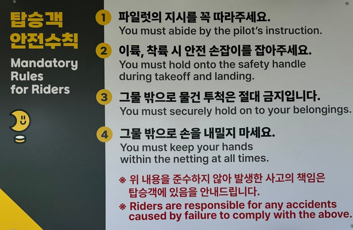 탑승객 안전 수칙 / 사진= 박한나 여행+ 기자 기울어지지 않기 위해 탑승객들과 팔 한쪽 간격 정도를 두고 널찍하게 섰다. 출발 신호를 알리는 안내에 한 손으로는 봉을 잡고,이륙하는 장면을 놓칠세라 다른 손으로 핸드폰을 들었다. ‘덜컹’하는 느낌도 잠시 붕 떠오르는 기분이 스쳤다. 생각보다 느린 속도에 의기양양해진 채로 핸드폰을 기울여 바깥 풍경을 촬영했다. 안전상 설치한 그물이 거슬렸지만,그물 사이로 카메라 렌즈를 맞추자 발밑으로 멀어지는 잔디밭이 눈에 들어왔다.