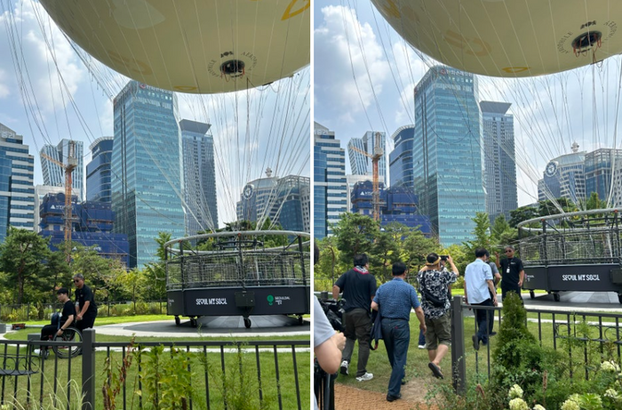 한강 전경(왼쪽),아래에서 바라본 기구(오른쪽) / 사진= 박한나 여행+ 기자 아름다운 전망을 구경하다 문득 아래를 내려다보니,안정적인 운행 덕분에 느끼지 못했던 높이가 새삼 실감이 난다. 탑승한 기구가 130m,자그마치 건물 43층 높이에 위치해 있다는 사실에 아찔한 기분마저 든다. 아래로 곤두박질치는 상상을 하던 참에,서울달의 안정성을 보장하는 파일럿의 안내가 들려온다.