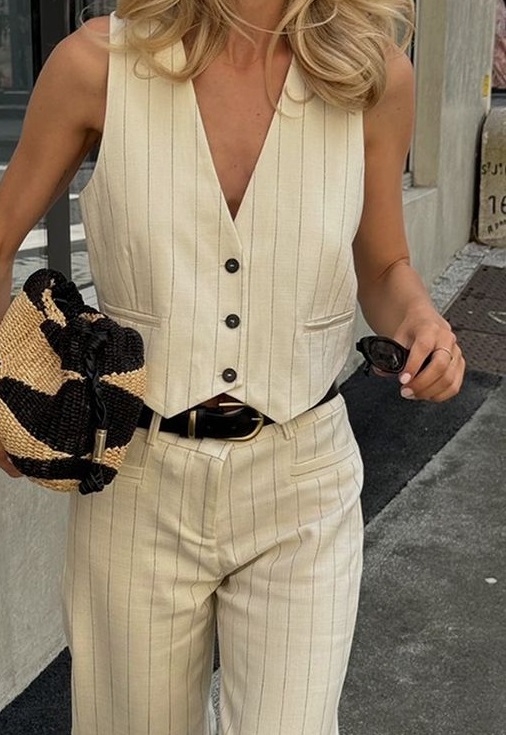 이런 핀터레스트 패션의 하나로 과거 남성들이 수트 안에 입던 ‘정장 조끼’를 최근 여성들이 상의로 즐겨 입고 있다. 조끼 안에 아무것도 착용하지 않고,단독으로 입어 나름의 비즈니스 캐주얼 의상으로 연출하고 있다.