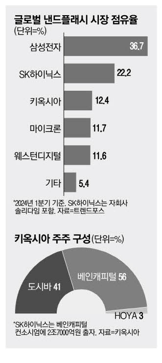 키옥시아는 2018년 일본 대기업 도시바로부터 분리 매각돼 현재의 사명으로 바뀌었다. 미국계 사모펀드인 베인캐피털이 주도하고 한국의 SK하이닉스와 함께 투자한 특수목적회사가 키옥시아홀딩스 지분 56%를 보유한 최대주주다. 이어 도시바가 41%의 지분을 보유하고 있다.