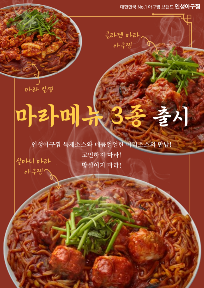 인생아구찜 관계자는 “10~30대 마라 열풍이 지속되고 있어 다양한 연령층을 공략하고자 신메뉴를 출시했다”며 “마라 본토인 중국에서도 검증된 맛으로 국내 고객들의 호응도 클 것으로 기대한다”고 말했다.