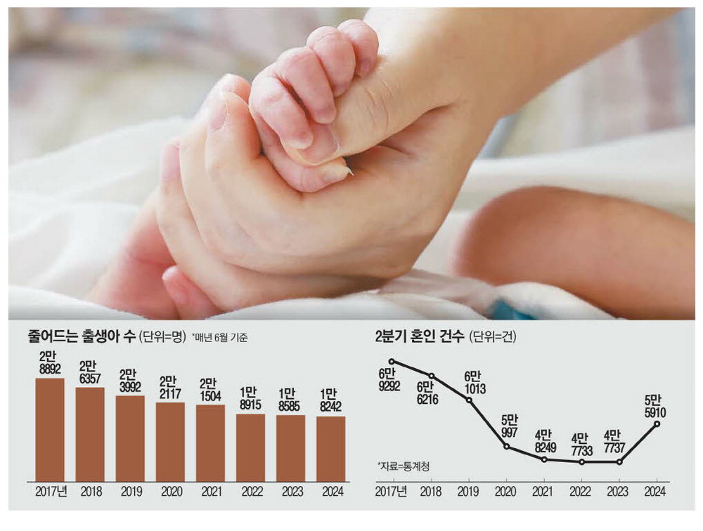 저출생 추세가 짙어지는 반면 혼인은 증가세다. 올 6월 혼인 건수는 1만6948건으로 1년 전보다 5.6% 늘었다. 6월 혼인 건수는 2022년 1만4897명,2023년 1만6052명,올해 1만6948명으로 최근 꾸준히 늘었다.