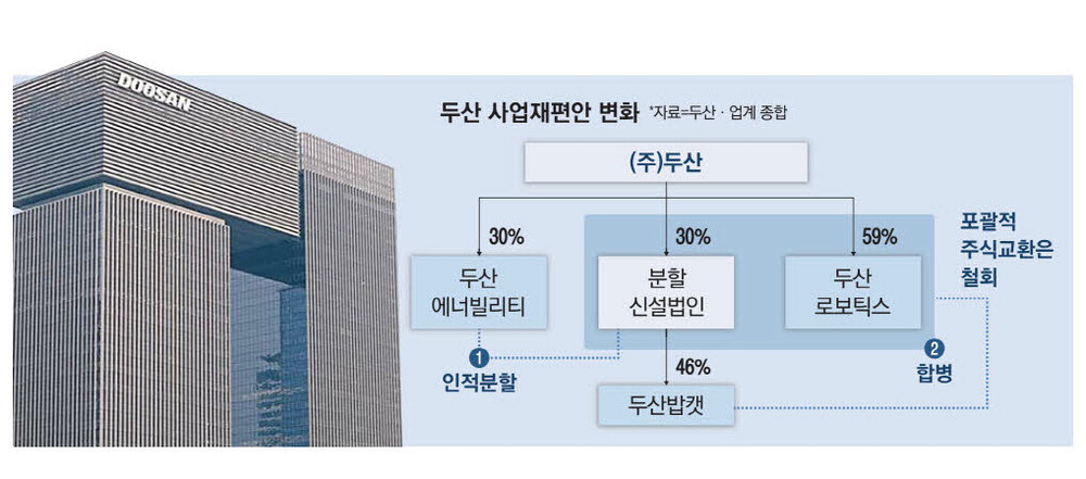 당초 두산그룹은 여기에서 한 걸음 더 나아가 두산로보틱스가 두산밥캣을 흡수합병하는 방안을 추진했으나 합병 비율(1대0.63)이 불공정하다는 금융당국과 소액주주들의 반발에 부딪히면서 이를 철회하기로 했다.