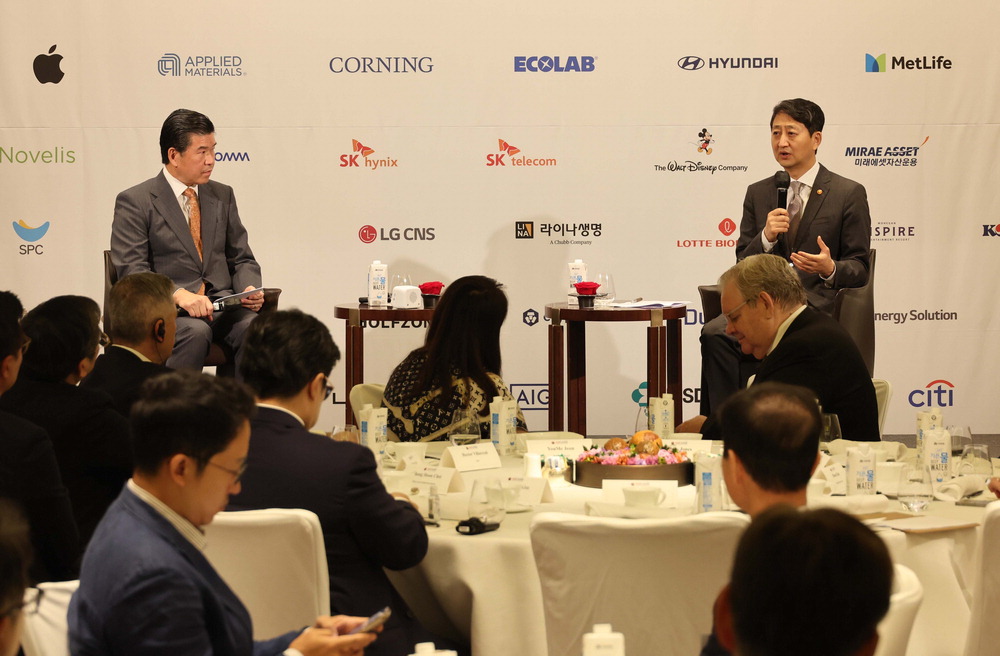 안덕근 산업통상자원부 장관(무대 오른쪽)과 제임스 김 주한미국상공회의소 회장이 29일 서울 포시즌스 호텔에서 열린 간담회에서 대화하고 있다. 이날 안 장관은 "올해는 350억달러 외국인 투자 유치를 통해 아시아의 비즈니스 중심지,최소한 아시아에서 투자 허브가 되겠다"고 밝혔다. 한주형 기자