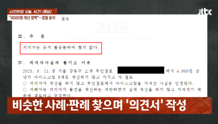 A씨 사건은 검찰로 넘어갔다. A씨는 CCTV 영상과 결제 내역 등 증거 자료와 의견서를 정리해 검찰에 제출했다. 그리고 최종적으로 절도 혐의에 대해 무혐의 처분을 받았다. A씨가 많은 횟수에 걸쳐 상품을 구입하고 결제한 내역이 있는 점과 가져간 물건의 가액이 4000원에 불과한 점을 들어 훔칠 이유가 없어 보인다고 판단한 것이다.