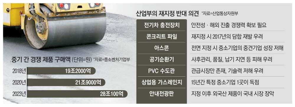 11일 매일경제 취재 결과 산업통상자원부는 최근 중소벤처기업부에 '2025~2027년 중소기업자 간 경쟁제품' 지정 반대 의견을 전달한 것으로 확인됐다. 안정성이 중요한 전기차용 충전장치,관급 시장 의존도가 높은 폴리염화비닐(PVC) 수도관과 아스콘,독점 및 담합 우려가 높은 상업용 가스레인지와 콘크리트 파일을 비롯한 총 12개 제품에 대해 공공조달 시장에서 중견기업과 대기업 진입을 허용해야 한다는 게 핵심이다.