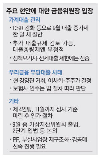 김 위원장은 손태승 전 우리금융 회장의 부당대출과 관련해서도 심각한 우려를 나타냈다. 그는 "횡령과 부정대출 이슈 등 우리금융에서 사고가 반복되는 데 대해서는 금융위원장으로서 심각한 우려를 가지고 있다"며 "현 경영진의 거취와 관련된 것은 기본적으로 우리금융 이사회와 주주총회에서 판단할 사안"이라고 말했다. 이어 "(우리금융의) 보험사 인수·합병도 법령이 정한 절차에 따라 심사를 진행할 예정이고,특정 방향성을 가지고 있는 것은 아니다"고 덧붙였다.