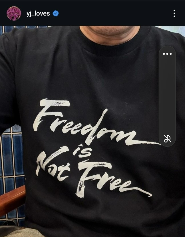 16일 정 회장의 인스타그램을 보면 ‘Freedom is Not Free’(자유는 공짜가 아니다)라는 영문 글귀가 새겨진 검은색 티셔츠 사진이 공개돼있다. 정 회장 본인이 입은 것으로 추정된다.