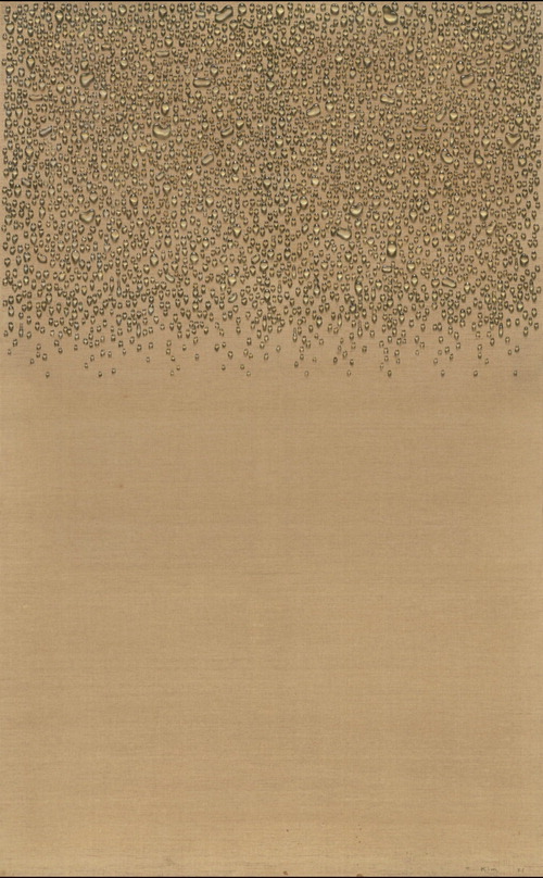 높이 2m에 달하는 대형 화면 상단이 물방울로 빼곡하다. 물방울이 위쪽에 쏠려 있어 금방이라도 쏟아져내릴 것 같다. 하지만 이 물방울들은 중력 같은 물리 법칙엔 아랑곳하지 않는 듯 저마다 다른 형태로 영롱한 빛을 낸다. 김창열 화백의 '물방울'(1973)이다. 이 작품은 2001년과 2015년,그리고 지난 4~6월 갤러리현대 전시와 2009년 부산시립미술관 전시를 통해 대중에게 선보인 이력이 있는 작품으로,김 화백의 1970년대 작업을 대표하는 주요 작품 중 하나로 꼽힌다.