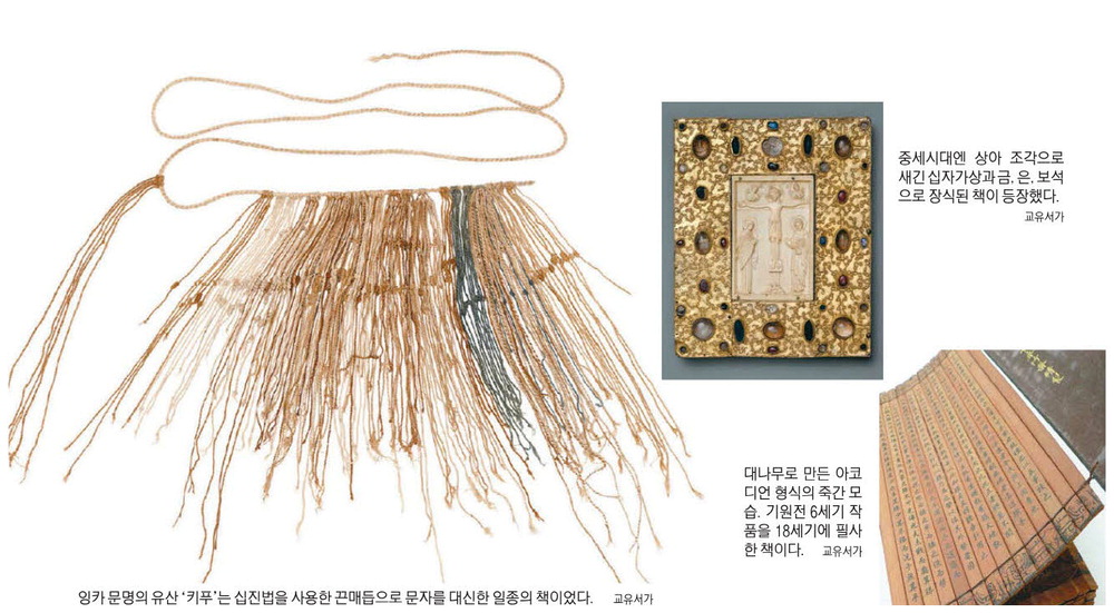 갑골문자나 점토판 등 낯익은 단어들은 건너뛰고,흥미를 돋우는 부분만 들여다보자. 현대 인류는 책을 대개 '종이책' 형태로 생각한다. 80억 인류가 태어나기 전부터 종이책만 봐왔으니 그럴 법도 하다. 하지만 위에서 언급한 '끈 매듭 책'처럼 옛날엔 기이한 책이 다수였다고 책은 쓴다.