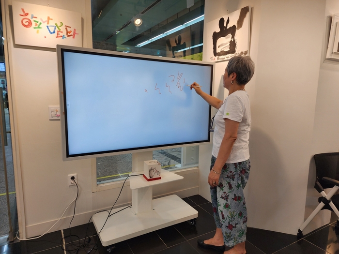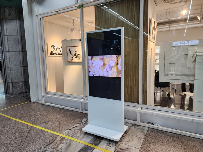 쎄쎄쎄마켓 전자칠판. <부자비즈> 쎄쎄쎄마켓이 도입한 스마트 기술은 전자칠판,디지털 사이니지,스마트 가마 등이다. 전자칠판은 다용도로 활용된다. 공예품 전시 판매 공간에서 미디어 아트로 갤러리 공간을 완성하는데 활용된다. 매장 규모가 작다 보니 공방과 공예협동조합에서 만든 작가들의 작품을 전시할 공간이 부족하다.