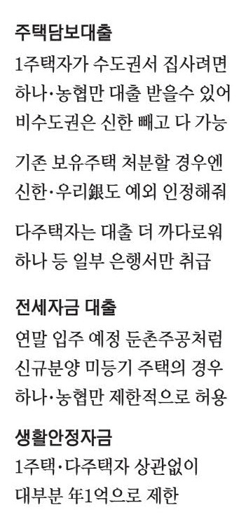 다주택자가 목적이 아니라 집 갈아타기에 나선 1주택자의 사정은 어떨까. 수도권 주택 갈아타기의 경우 애초부터 주담대를 내주는 하나·농협은행은 물론 국민·신한·우리은행도 가능하다. 단,이들 3곳 은행에는 주담대 실행 당일에 기존 보유 주택을 매도하는 조건이 걸려 있다. 비수도권 주택 갈아타기의 경우에는 신한은행만 기존 주택 처분 조건이 걸려 있을 뿐 다른 은행들은 자유롭다.