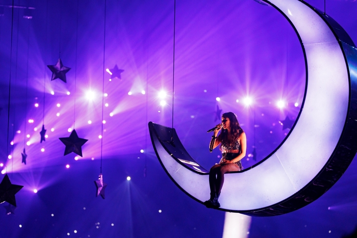 2024 ‘거츠(GUTS) 투어’ 중 초승달 조형물 위해서 노래하는 올리비아 로드리고. 사진제공=라이브네이션코리아·ⓒChris Polk