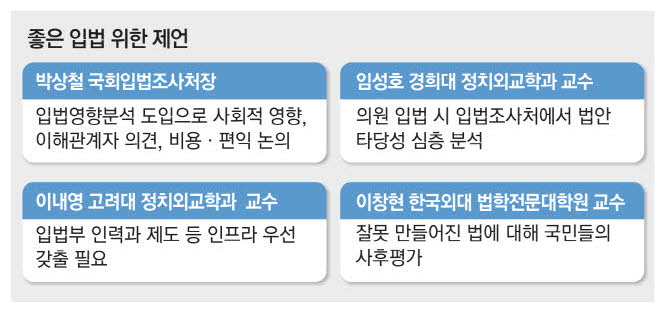 22일 정치권과 학계에 따르면,입법 거름망 역할을 하는 입법영향분석 도입이 부실 입법 방지의 시작점이란 의견이 지배적이다. 이 제도는 법안을 상정할 때 법안 시행 후 사회적 영향 분석을 동반하도록 해 졸속·과잉 입법을 막는 역할을 한다. 박상철 국회입법조사처장은 "자동차가 중요 부품(입법영향분석) 없이 달리면 굉장히 불안하지 않느냐"며 "법안을 발의하거나 심의할 때 어떤 사회적 영향이 있고,이해관계자의 의견은 어떻고,비용과 편익은 어떤지,외국 사례 등을 논의하면 훨씬 좋은 법률이 만들어질 것"이라고 강조했다. 이런 과정을 통하면 정당 간 정쟁에 그치지 않고 보다 실질적인 공론화도 이뤄질 수 있을 것이란 시각이다.