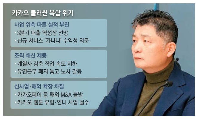 국내 대표 플랫폼 기업 카카오가 사법 리스크 장기화로 중대 기로에 섰다. 성장이 정체되면서 실적 부진에 빠졌고,계열사 정리 등 쇄신 작업에도 제동이 걸렸다. 인공지능(AI) 투자와 인수·합병(M&A) 등 신사업 추진에도 차질이 생기는 등 '3중고'에 시달리고 있다.