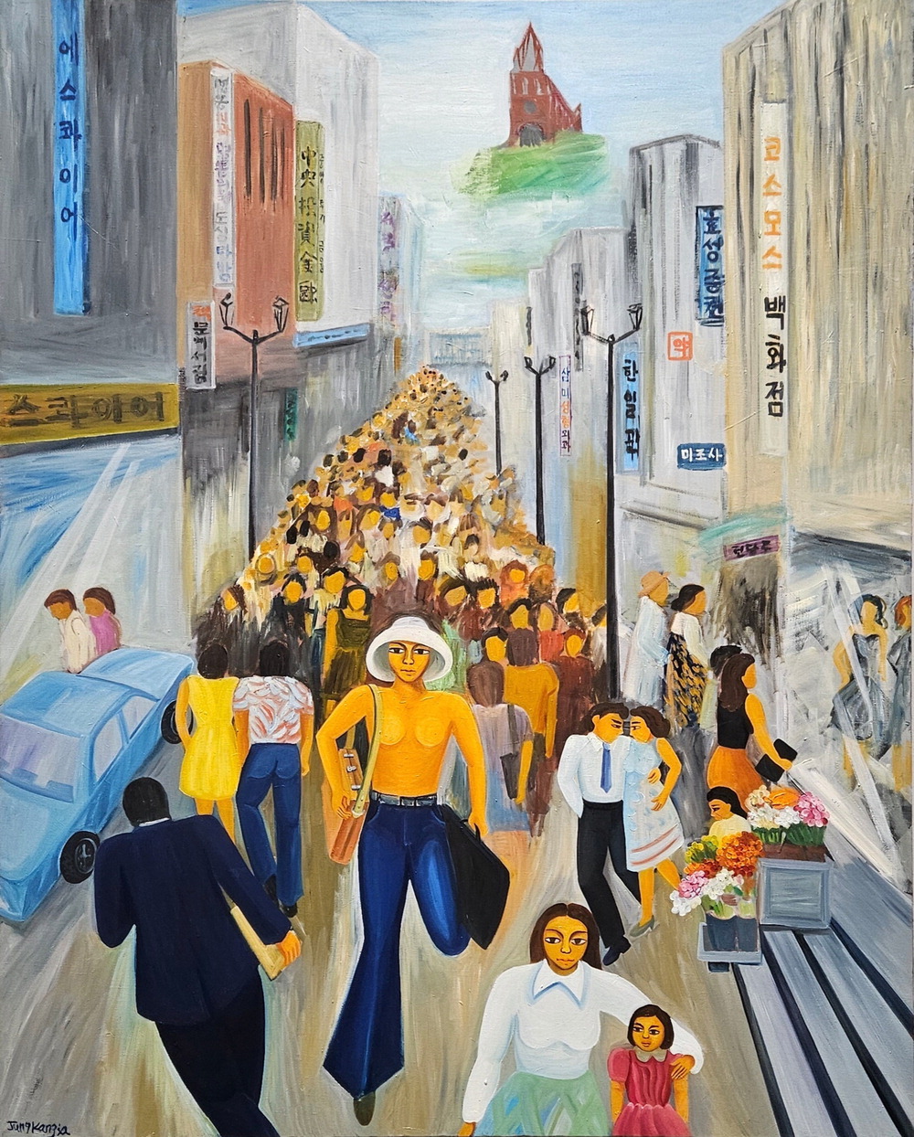 때는 1970년대. 북적이는 서울의 명동 거리 한복판에서 한 여성이 상의를 탈의한 채 맨가슴을 드러내고 당당하게 활보하고 있다. 흰 벙거지에 한껏 펼쳐진 청 나팔바지를 입은 그녀는 한 손엔 핸드백,다른 한 손엔 스케치북 가방까지 든 세련된 모습이다. 특별한 개성이 느껴지지 않는 군중과는 확연히 대비된다. 주변의 시선 따위는 신경 쓰지 않는 여성의 주체적이고 당당한 태도를 드러낸 한국의 1세대 여성 화가 정강자(1942~2017)의 회화 '명동'(1973)이다.