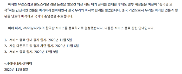 그러다 돌연 “일부 계정들이 여전히 중국을 욕하고 있다”며 “우리의 마지막 한계를 넘었다. 중국 기업으로서 이러한 행위를 단호히 배격하고 국가의 존엄성을 수호한다”는 입장문과 함께 한달여만에 한국 서비스를 일방적으로 종료했다.