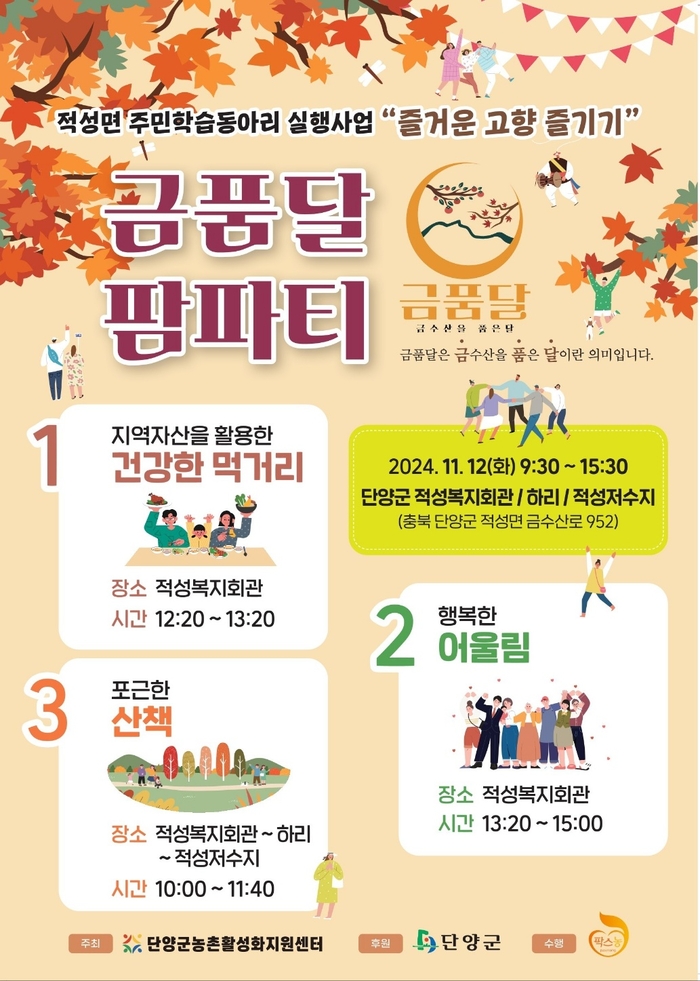충청북도 단양군 적성면 주민학습동아리 ‘금품달’(금수산을 품은 달)이 적성복지회관에서 ‘즐거운 고향 즐기기 금품달 팜파티’를 개최했다고 12일 밝혔다.