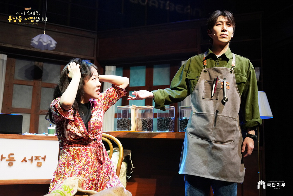 뮤지컬 '어서오세요,휴남동 서점입니다'에서 커피에 대해 이야기하는 배우들. 극단 지우