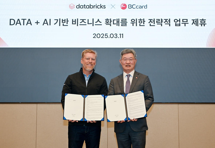 협약식에 참석한 론 가브리스코(Ron Gabrisko) 데이터브릭스 CRO(최고수익책임자),최원석 BC카드 사장(왼쪽부터). [사진=데이터브릭스] 데이터,AI 기업 데이터브릭스(Databricks)는 BC카드가 전사적인 데이터 및 AI 혁신을 위해 데이터브릭스 데이터 인텔리전스 플랫폼을 도입했다고 11일 밝혔다. 이번 협력은 데이터브릭스가 지난해 11월 금융보안원의 클라우드 서비스 제공업체(CSP) 보안 및 안전성 평가를 완료한 데 이어 성사된 전략적 파트너십이다.