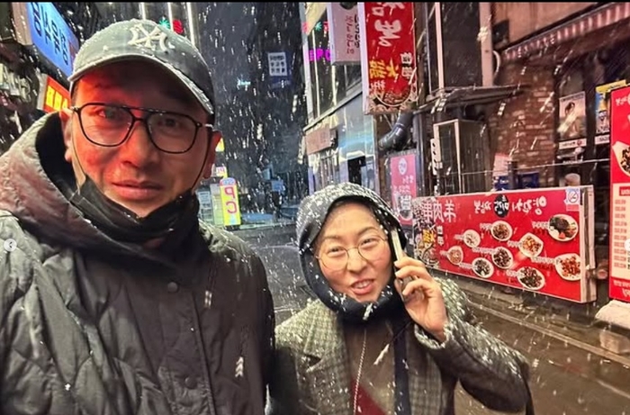 공개된 사진 속에는 눈이 펑펑 쏟아지는 날 길거리를 걷는 하정우와 강말금의 모습이 담겼다.