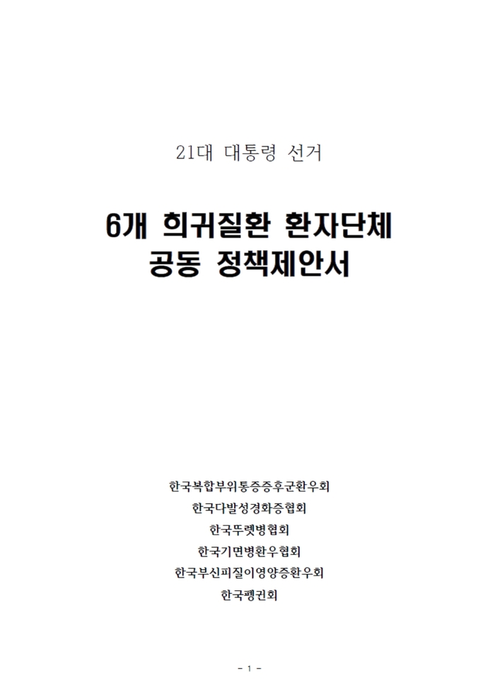6개 희귀질환 환자단체는 21대 대통령선거를 맞아 해당 질환자의 치료환경과 처우 개선이라는 공통의 목표를 담은 정책제안서를 더불어민주당,국민의힘,개혁신당의 정책위원회 등에 각각 전달했다