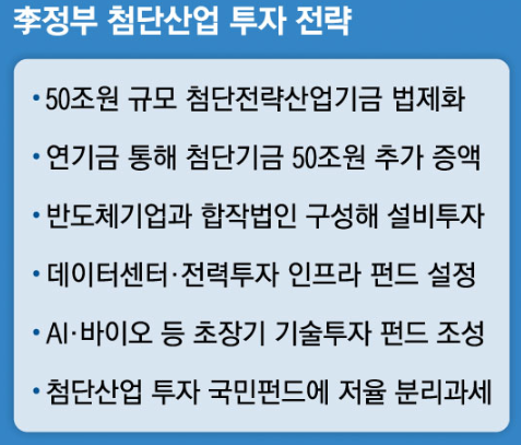 첨단산업기금이 직접 반도체 기업과 합작법인을 만들어 반도체 팹(공장)에 투자하고,팹에 필요한 전력·용수·AI 데이터센터 등 유관 시설에 투자하는 별도 인프라스트럭처 펀드도 조성한다.