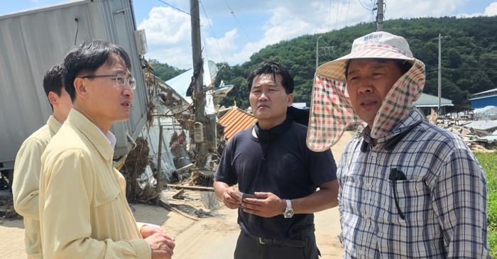 임광현 국세청장(왼쪽)이 25일 경남 산청군을 방문해 폭우 피해 상황을 점검하고 있다. [사진제공=국세청] 국세청은 추후 특별재난지역으로 추가 선포되는 지역에도 법인세 중간예납세액의 납부 기한을 2개월 직권 연장하는 세정 지원을 실시하겠다고 25일 밝혔다.