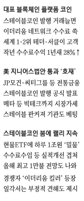 가상화폐 업계 일각에서는 올해 이더리움이 1만달러까지 오를 수 있다고 전망한다. 약 3700달러인 현 가격의 2.7배까지 상승 여력이 있다는 얘기다. 미국을 필두로 한 스테이블코인 붐으로 ETF를 통한 자금 유입이 본격화된다는 게 근거다.