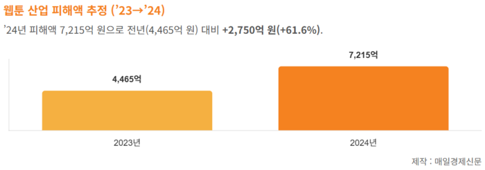 지난해 기준 불법 유통으로 인한 웹툰산업 피해액은 7215억원으로 집계됐다. 지난 2023년 피해액(4465억원)을 크게 웃돈다. 뉴토끼 뿐만 아니라 북토끼를 통해서도 웹소설이 공유되고 있어 실제 피해액은 더 클 것으로 추정된다.