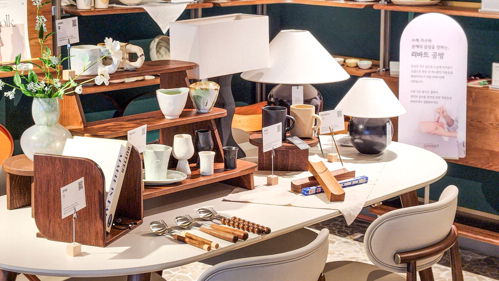 현대리바트는 이 공간에 리바트 공방에 입점한 수제 가구·공예품 공방 23곳의 제품 100여 개를 선보인다. 접시,보석함,그릇,도자기 같은 공예품과 소형 가구를 전시하고 제품별로 온라인 구매 페이지에 연결되는 QR 코드를 비치해 고객이 상품을 확인한 후 즉시 구매할 수 있게 했다.