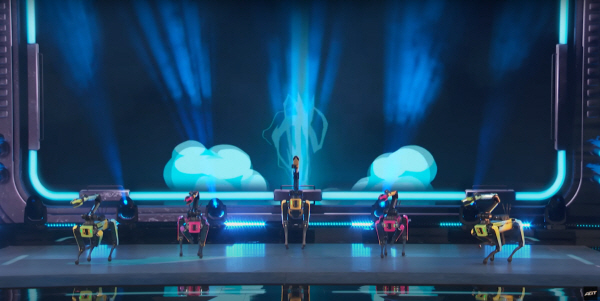 26일 미국 TV쇼 ‘아메리카 갓 탤런트’ 생방송 무대에서 보스턴다이내믹스 스팟이 안무를 선보이고 있다 [이미지 출처=아메리카 갓 탤런트(America’s Got Talent) 유튜브 채널] 곧이어 다섯 대의 스팟이 빠른 노래에 맞춰 경쾌한 발놀림과 통통 튀는 안무를 선보였다. 머리부터 발끝까지 부드럽고 정교하게 움직이며 서로 간의 호흡을 맞추는 듯한 모습으로 마치 아이돌의 ‘칼군무’ 같이 화려한 무대를 펼쳤다.