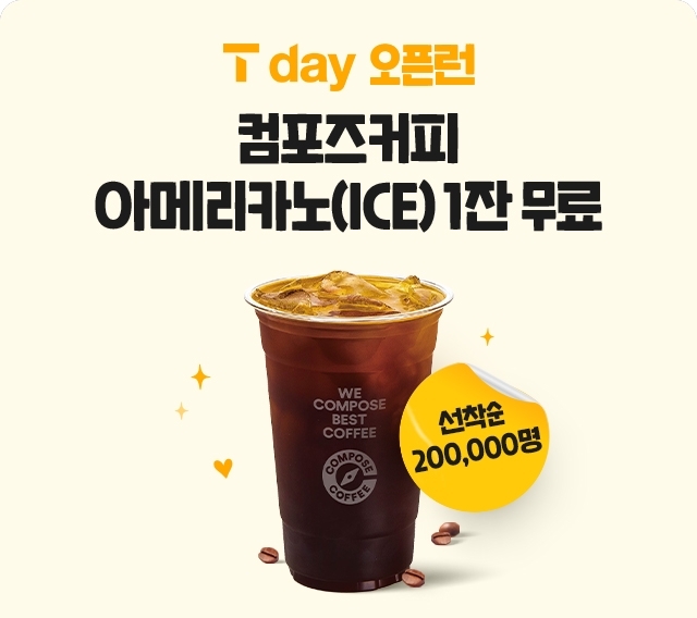 [사진제공=컴포즈커피] 커피 프랜차이즈 컴포즈커피가 SK텔레콤과 손잡고 3일 단 하루 아이스 아메리카노 20만잔을 무료로 제공하는 ‘T Day 오픈런’ 제휴 프로모션을 진행한다.