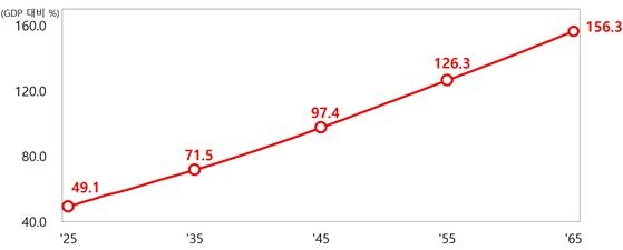 저출생·고령화발 의무지출,GDP 23%까지 불어난다 [사진 출처 = 연합뉴스] 이번 전망에 따르면 2065년 GDP 대비 국가채무비율은 156.3%로 추계됐다. 인구(중위) 및 성장(중립) 시나리오를 중간값으로 설정한 결과다.