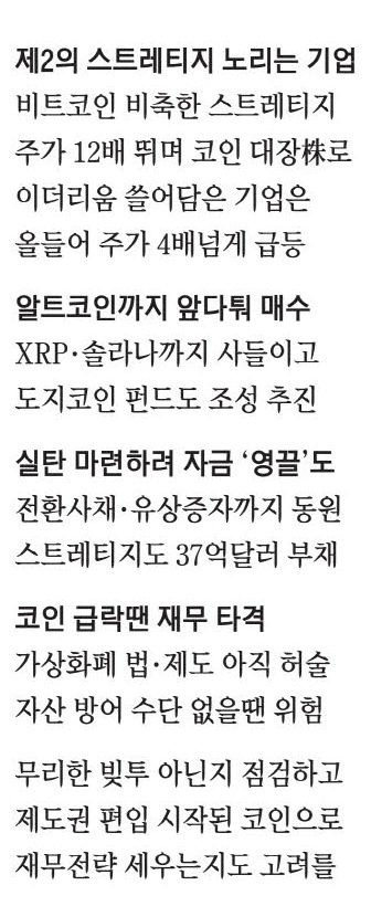 미국 소프트웨어 서비스 기업인 스트레티지의 비트코인 투자가 대박을 터뜨리면서 가상화폐를 대규모로 매입하는 '가상화폐 재무전략'이 여러 코인으로 확산되고 있다.