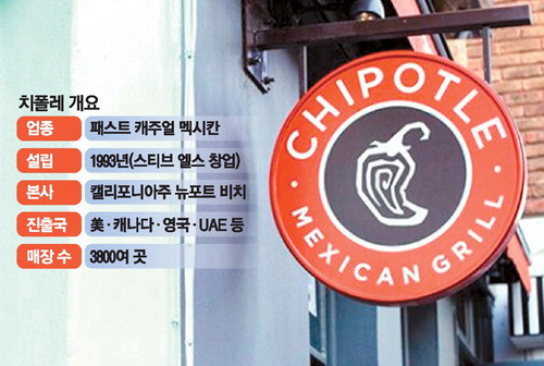 치폴레는 1993년 미국에서 시작된 멕시칸 패스트푸드다. 부리토,타코,볼,샐러드,케사디야를 팔면서 주문자가 주재료와 토핑을 고르는 방식을 채택한다. 미국 투자은행인 파이퍼 샌들러 조사에서 지난해 상반기 미국 10대들이 선호하는 브랜드 2위에 오를 정도로 인기다. 미국에서 유학한 한국 학생들이 '치폴레'앓이를 토로할 만큼 유학생에겐 그리운 존재로 꼽힌다.