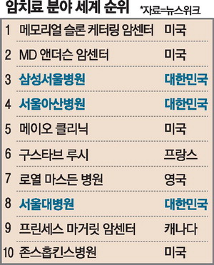 암 치료 10위내 한국 3곳