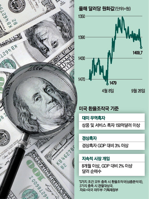 구체적으로 미국이 11월께 발간하는 환율보고서와 관련해서 양국 간 논의가 이뤄진 것으로 알려졌다. 미국 재무부는 작년 11월과 올해 6월 두 차례 연속 한국을 관찰대상국 명단에 포함했다. 대미 상품·서비스 무역흑자가 연간 150억달러를 넘긴 데다,대미 경상흑자가 국내총생산(GDP) 대비 3% 이상을 기록했기 때문이다. 달러 순매수 개입은 없었기 때문에 환율조작국(심층분석국)에 포함되진 않았다.