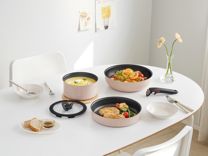 테팔이 13일 출시한 매직핸즈 컬렉션 ‘크렘드피치’. 핑크베이지색 냄비와 프라이팬 등으로 구성됐다. <테팔>