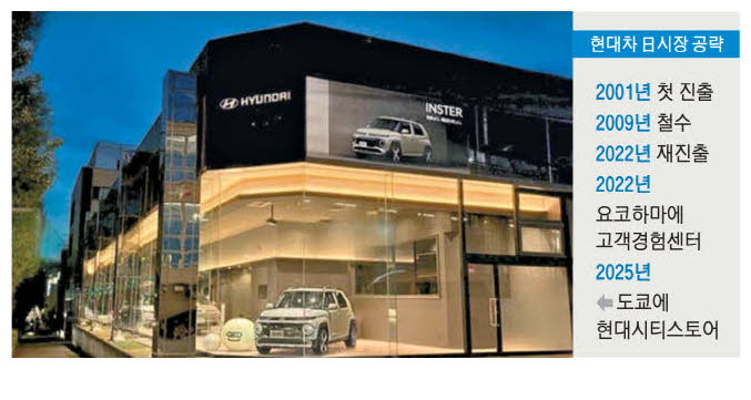 2001년 일본에 진출했던 현대차는 현지 완성차의 브랜드 파워와 보수적 소비자 기호로 인해 2009년 승용차 판매를 철수한 바 있다. 하지만 친환경차 시장 성장이 본격화한 2022년 전기차(EV)와 수소차를 앞세운 '무공해차량(ZEV)' 전략으로 다시 일본 시장 문을 두드렸다. 재진출 당시 일본 전역에 딜러망 없이 온라인 판매 방식으로 시작해 '디지털 전환' 흐름을 주도한 뒤 같은 해 요코하마에 '현대 고객경험센터'를 개설해 첫 오프라인 공간을 확보했다.