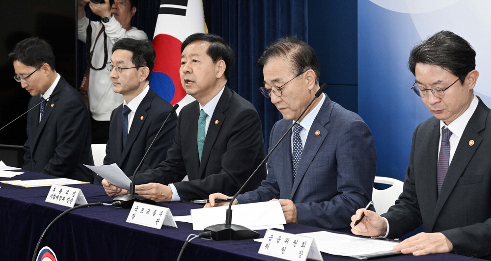 구윤철 경제부총리 겸 기획재정부 장관이 15일 정부서울청사에서 주택시장 안정화 대책 관계부처 합동브리핑을 하고 있다. 왼쪽부터 임광현 국세정창,윤창렬 국무조정실장,구 부총리,김윤덕 국토교통부 장관,이억원 금융위원장. 김호영 기자
